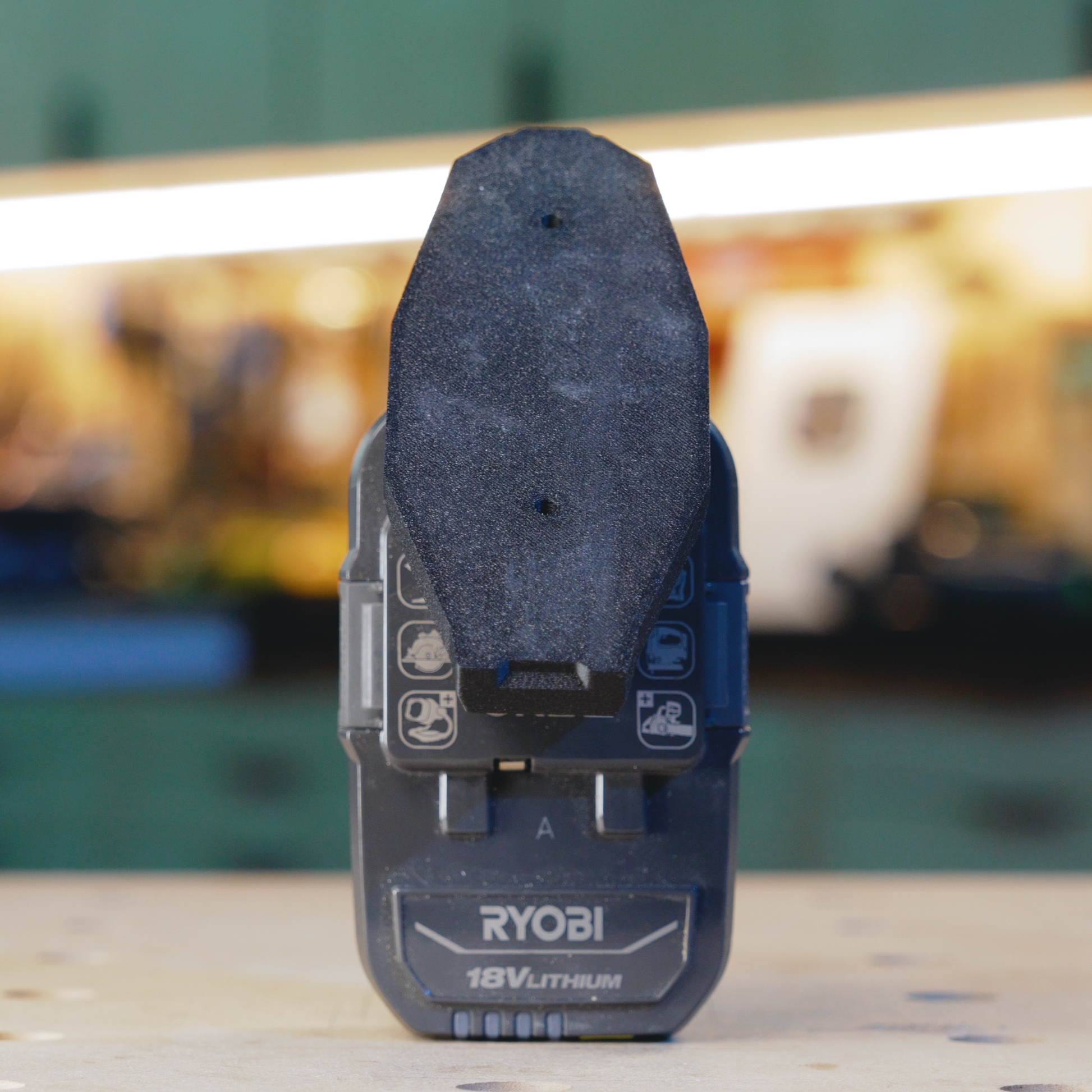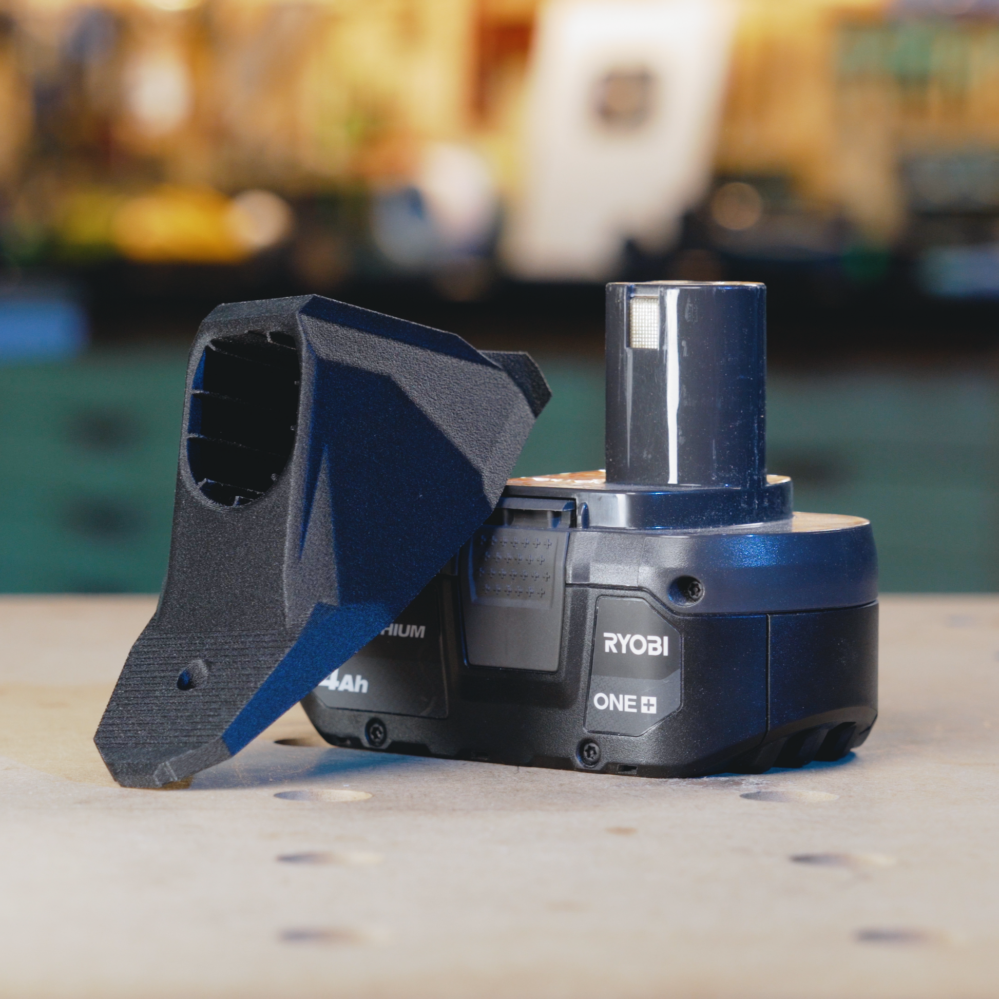 This 3D printed battery holder can be screwed onto a cabinet either vertically or upside down. A Ryobi 18v battery slides in and securely clicks into place. Not compatible with 12v batteries.