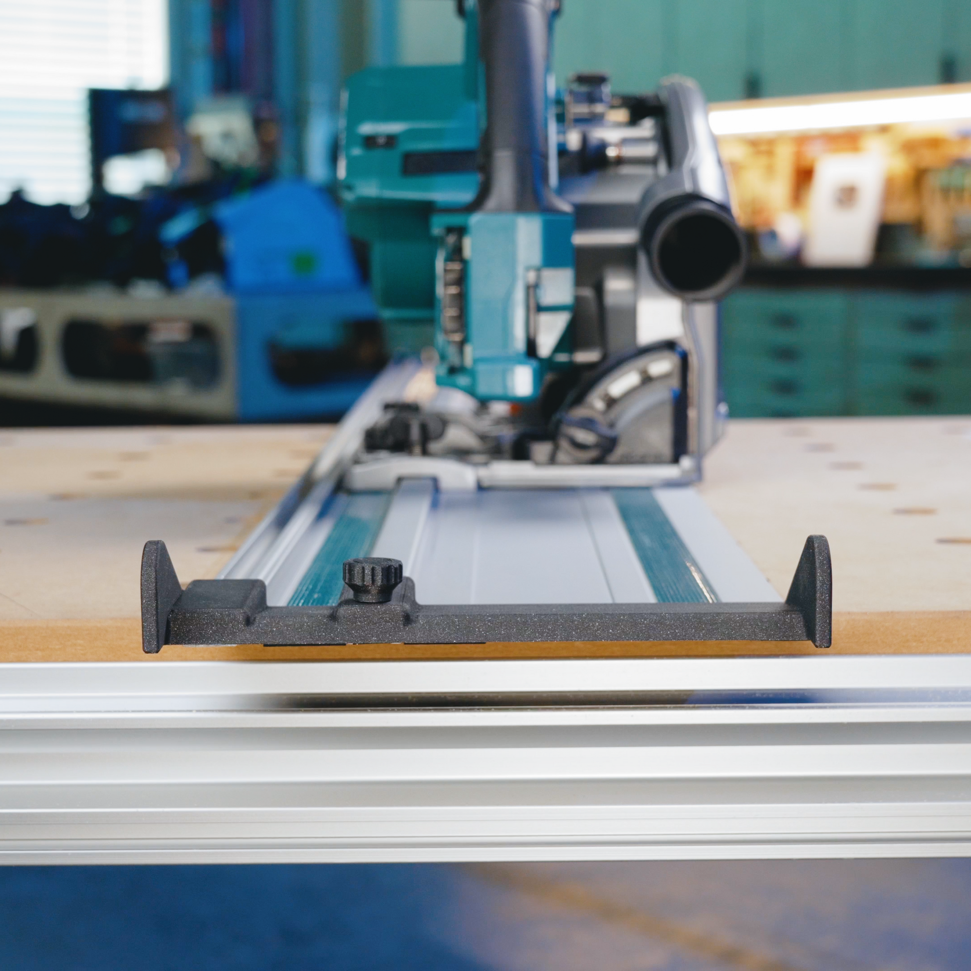 This deflector slides onto the end of your Makita guide rail and tightens up with a thumbscrew. No tools are needed! It helps guide your hose and power cord onto the track and keeps the sharp track from digging into, snagging, or harming your cord and hose.