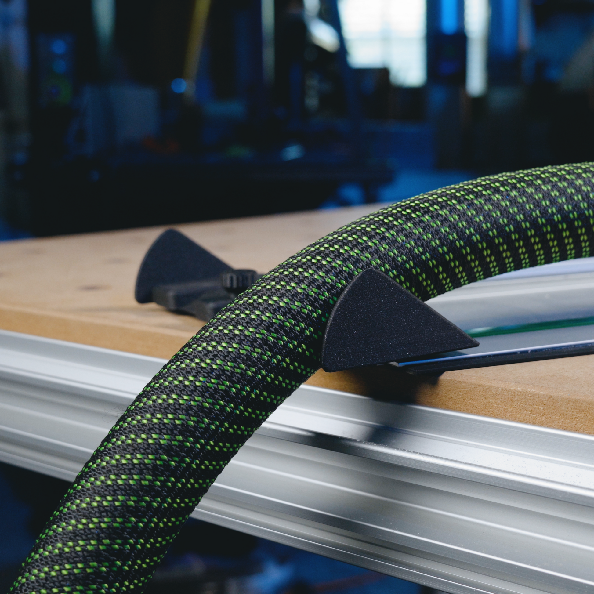 Track saws are great, but the sharp aluminum edges can cause your hose and cord to snag - or worse - cut.